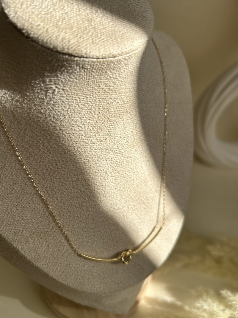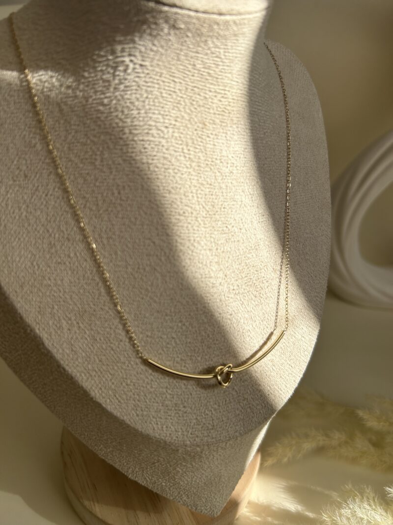 Minimaliste et raffiné, ce collier en acier doré se distingue par son pendentif en forme de barrette incurvée, délicatement nouée en son centre. Symbole de lien et d’harmonie, ce design épuré s’adapte à toutes les occasions : du quotidien aux soirées habillées. Léger et intemporel, il se porte aussi bien seul pour un look discret que superposé avec d’autres colliers pour un style tendance et personnalisé.