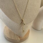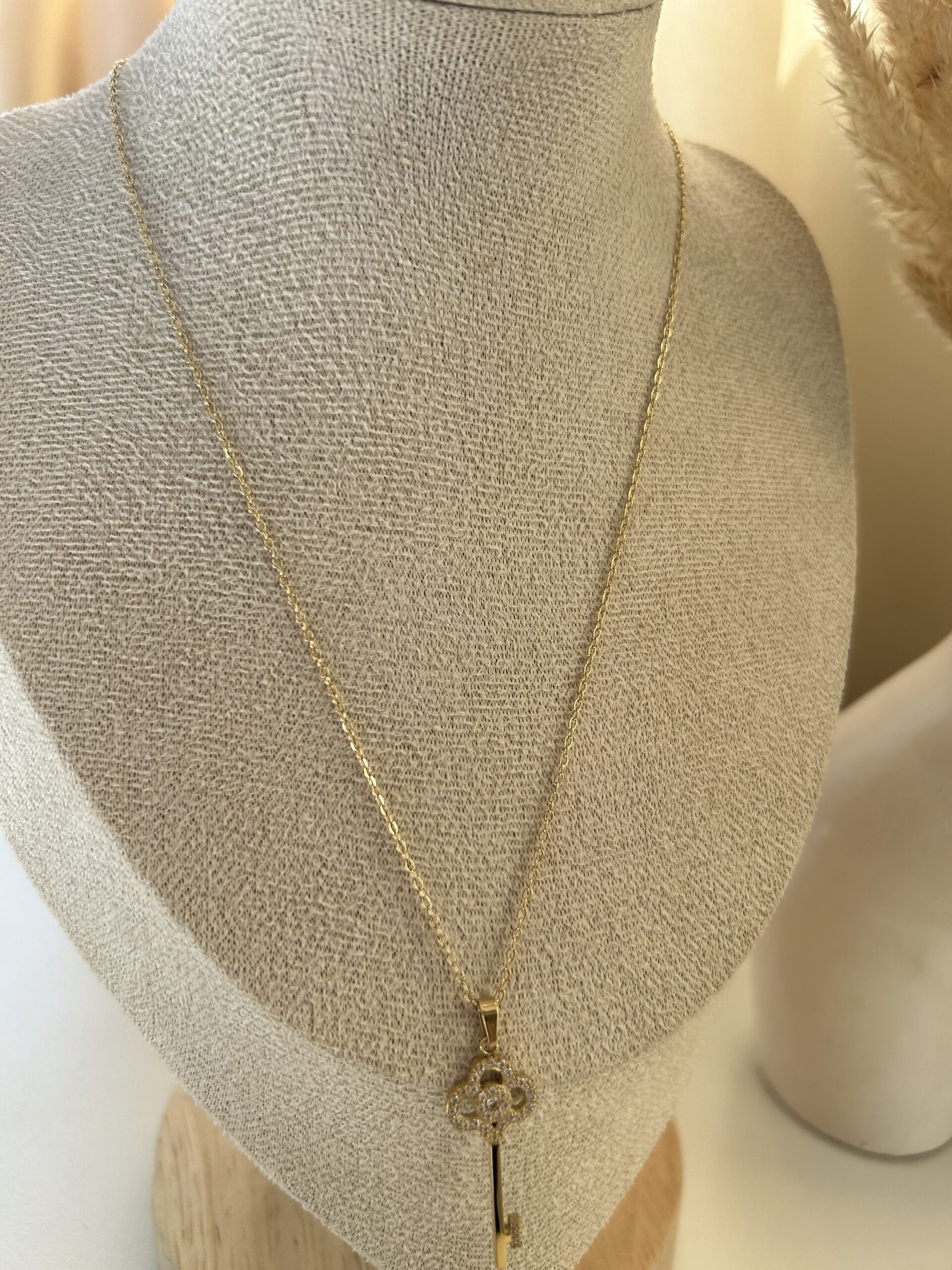Un collier raffiné en chaîne dorée, orné d’un pendentif en forme de clé délicatement travaillé. La tête de la clé est décorée de petits brillants qui lui apportent une touche lumineuse et féminine. Son design symbolique — la clé du cœur, de la chance ou de nouveaux horizons — en fait un bijou parfait à offrir ou à porter au quotidien pour sublimer n’importe quelle tenue.