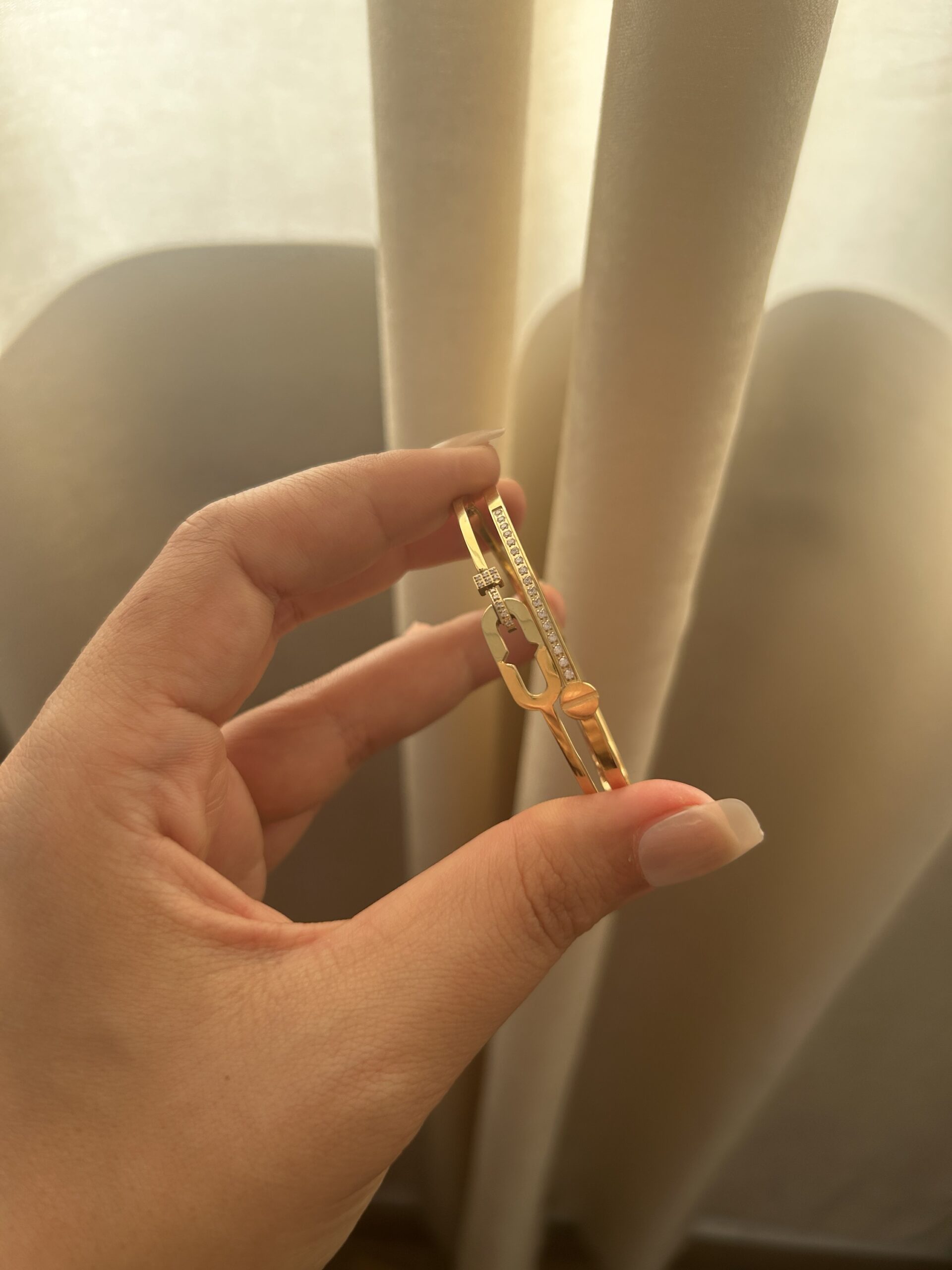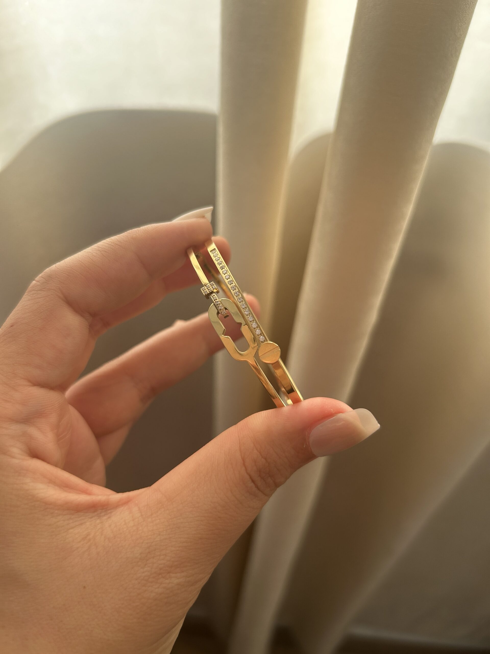 Ce bracelet doré séduit par son style raffiné et intemporel. Son éclat subtil et ses détails soignés en font un bijou parfait pour rehausser un look moderne et féminin. Léger et élégant, il s’adapte facilement à toutes les tenues.