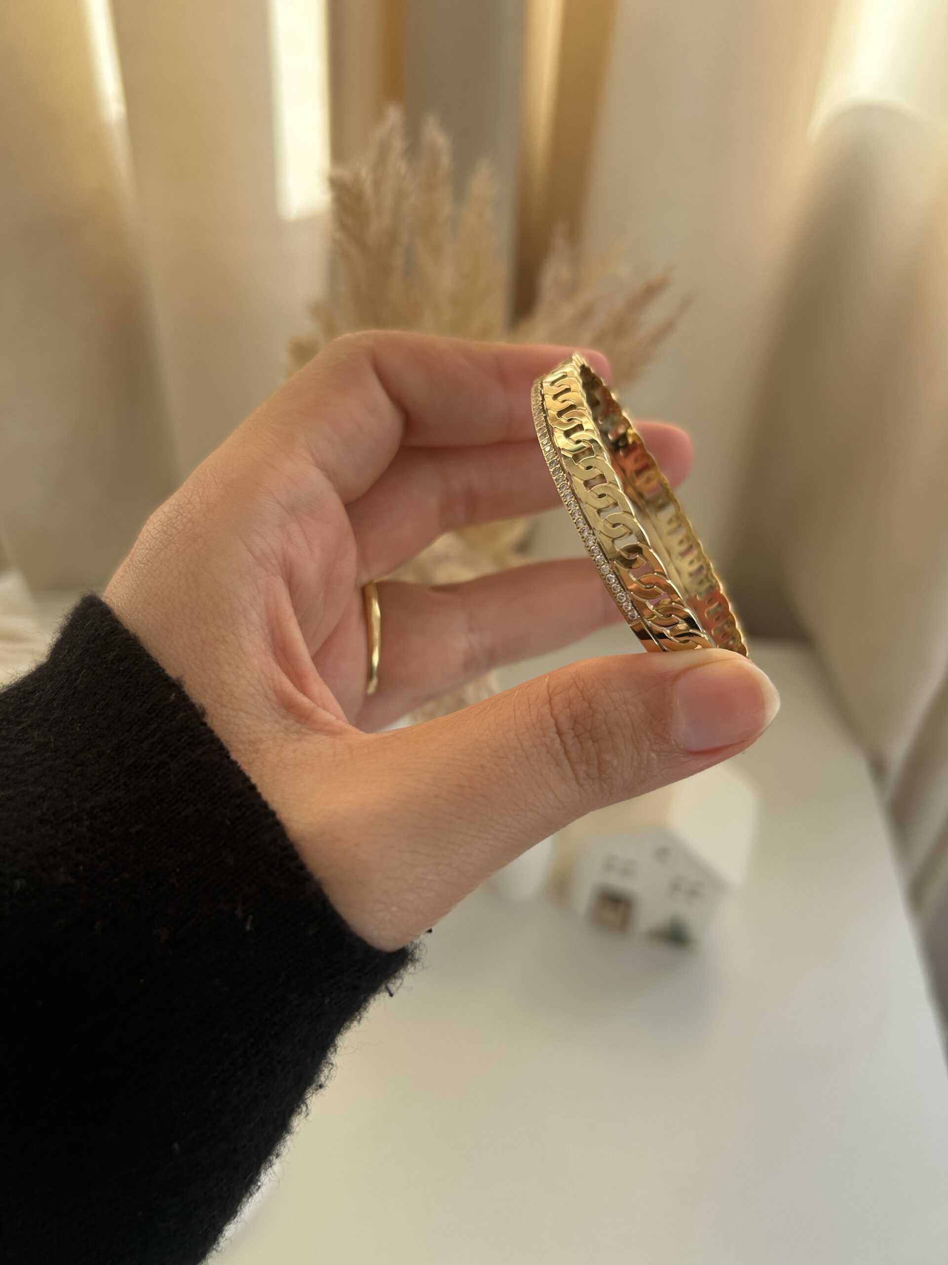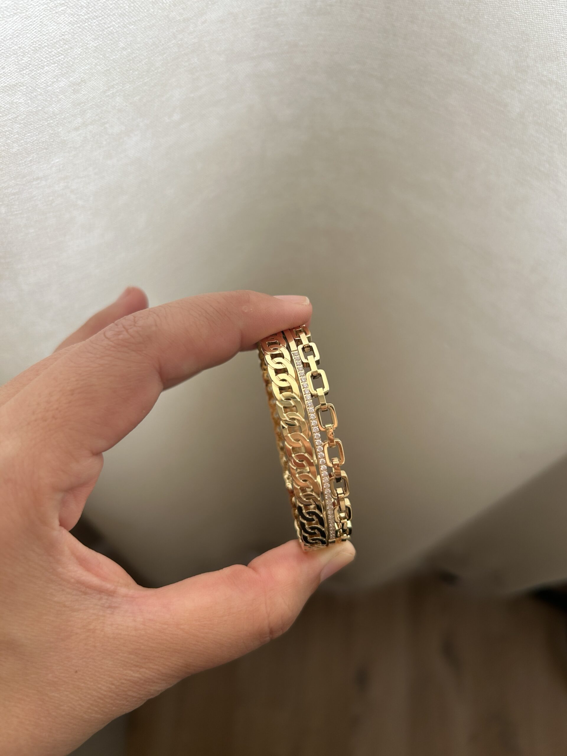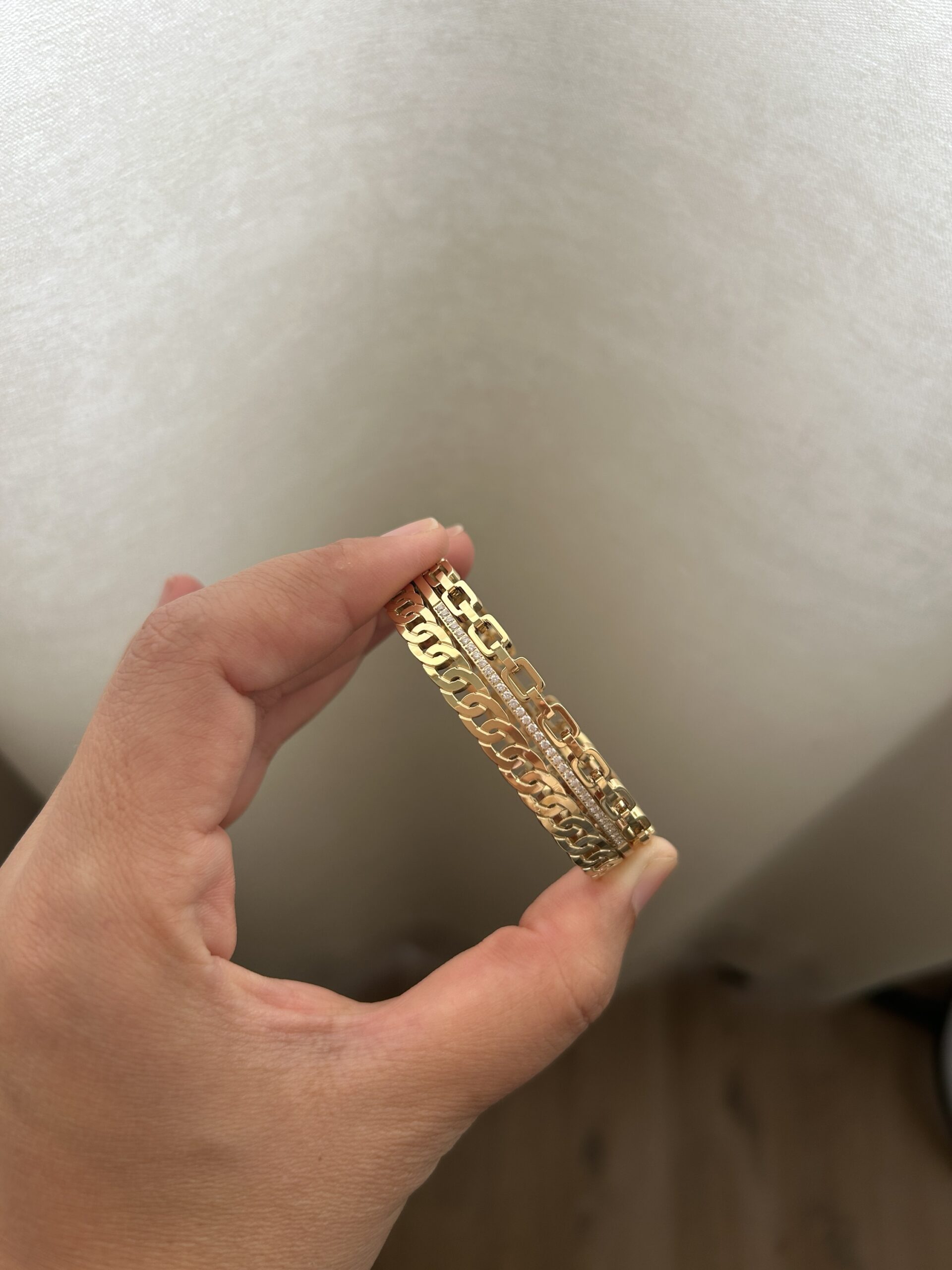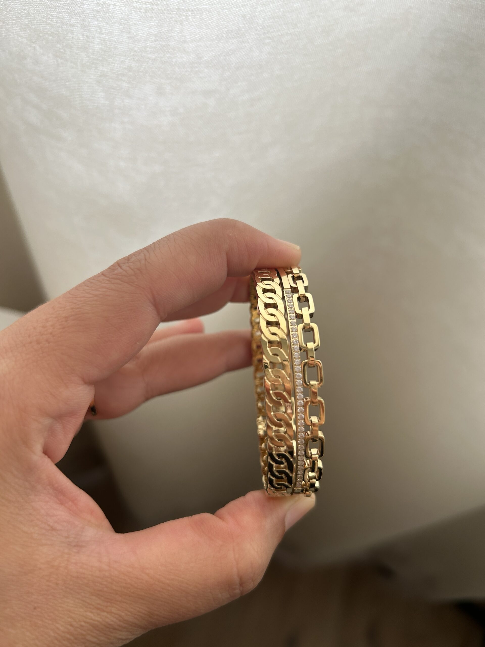 • Le Design : Un assemblage harmonieux composé d’une maille gourmette plate robuste, d’un jonc serti de cristaux scintillants pour la touche de lumière, et d’une maille rectangulaire ajourée ultra-tendance.