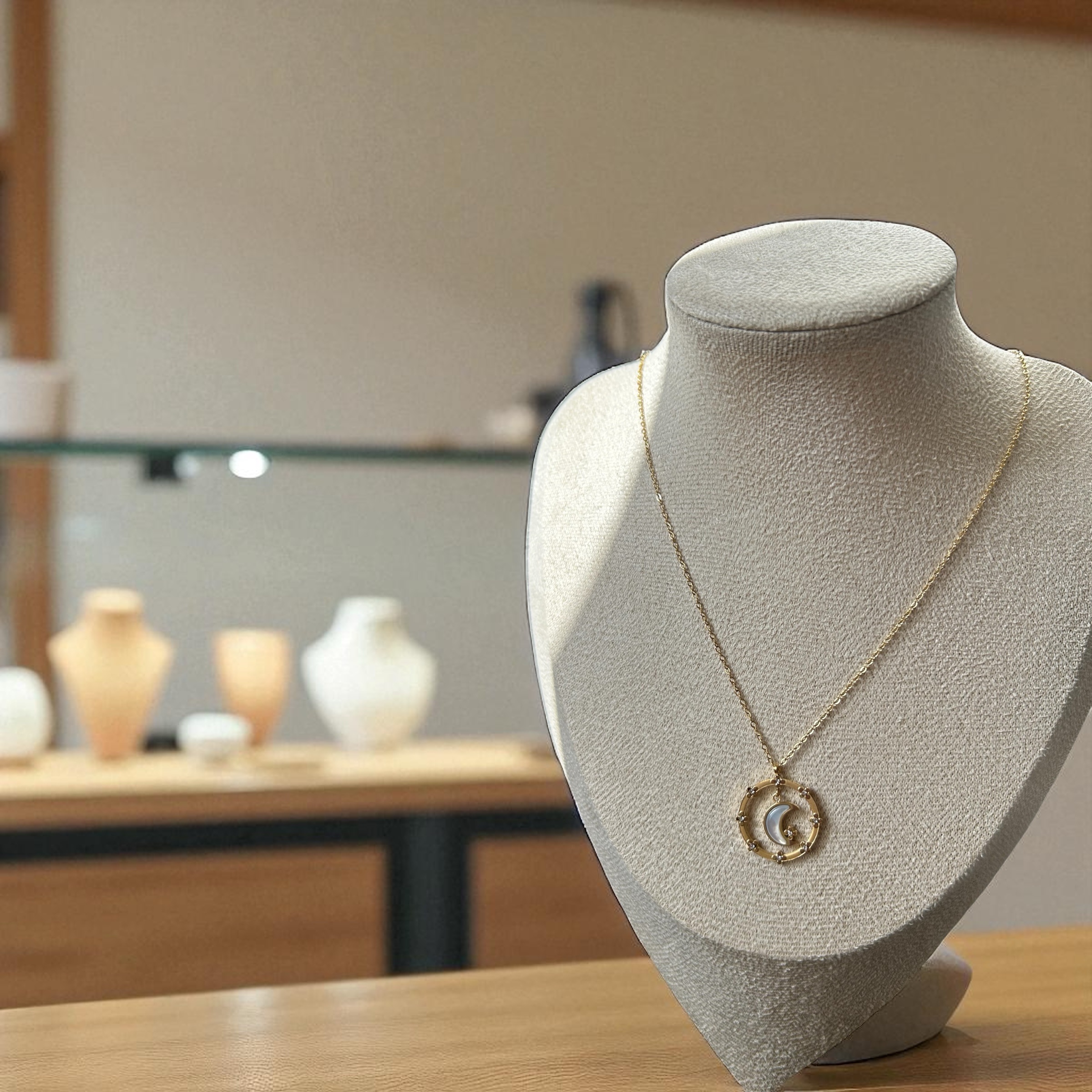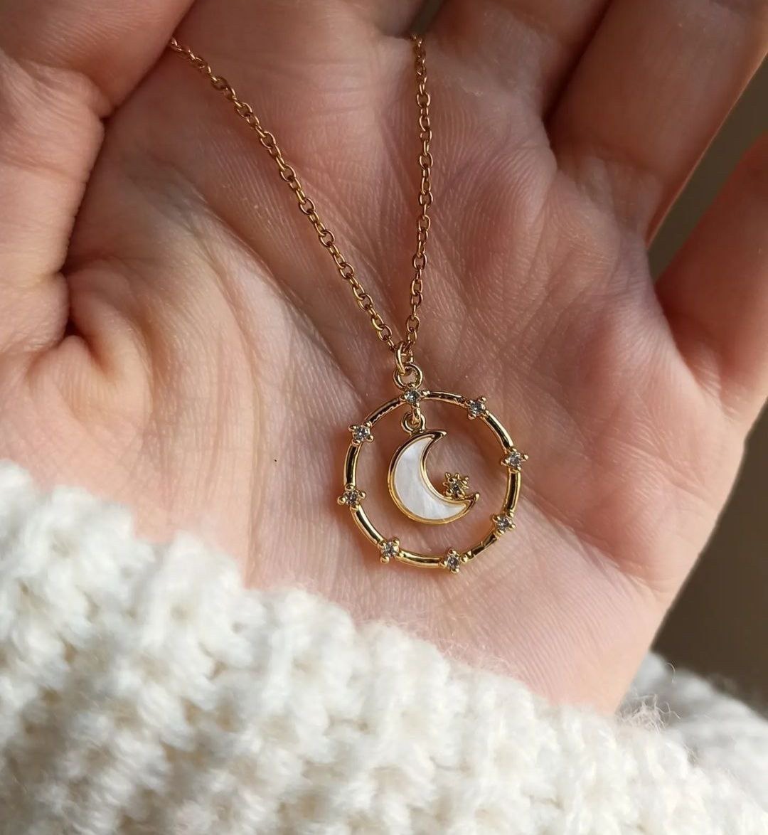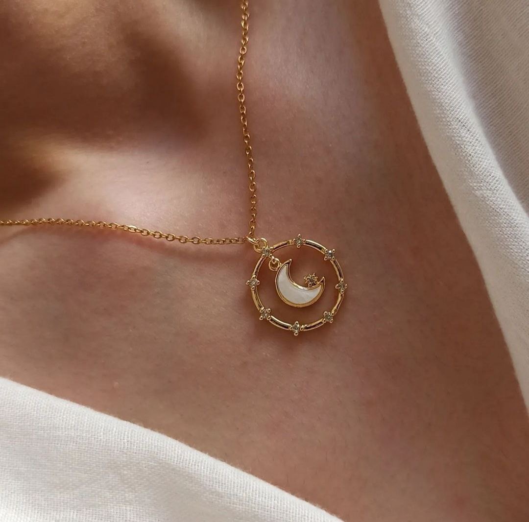 Élégant et intemporel, ce collier doré met en valeur la lune, délicatement ornée de strass. Leur éclat raffiné évoque la douceur et la pureté, tandis que la courbe dorée apporte une touche moderne et féminine. Un bijou discret mais sophistiqué, idéal pour sublimer une tenue de tous les jours ou accompagner une occasion spéciale.
