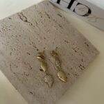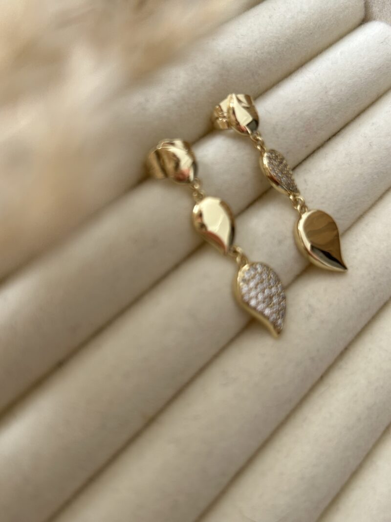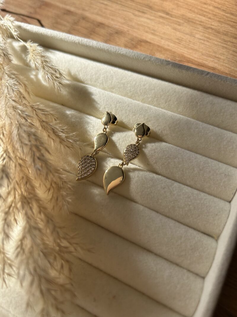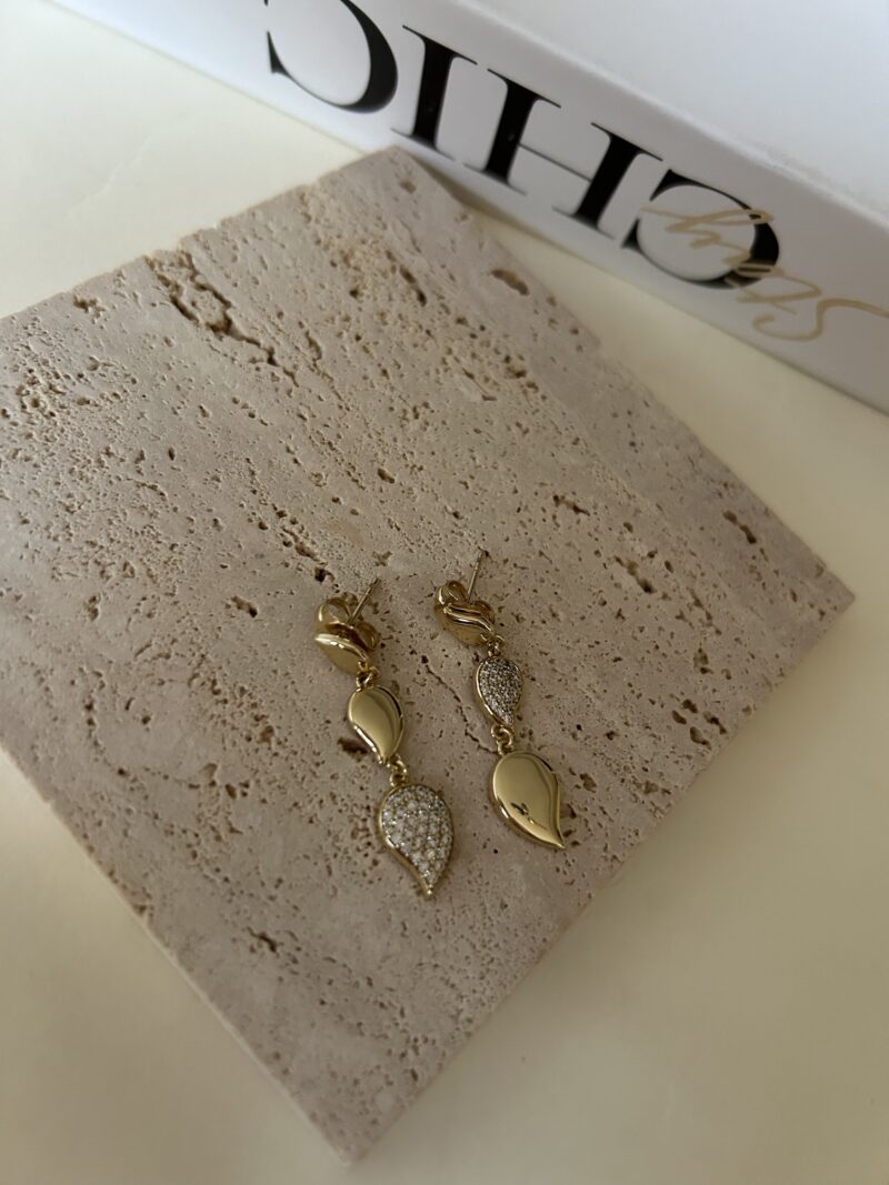 Ces boucles d’oreilles pendantes doré associent douceur et éclat. Leurs motifs en forme de gouttes, ornés de pierres scintillantes, reflètent la lumière avec raffinement. Féminines et sophistiquées, elles subliment le port de tête et s’adaptent aussi bien à une tenue de soirée qu’à un look chic du quotidien.
