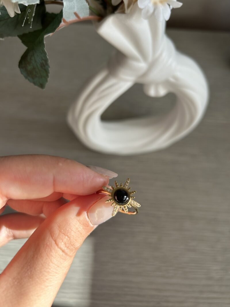 Cette élégante bague en acier inoxydable doré est ornée d’une pierre centrale noire. Le design autour de la pierre rappelle des rayons de soleil, créant un motif éclatant et captivant. L’acier inoxydable, connu pour sa durabilité et sa résistance à la corrosion, assure que cette bague conservera son éclat et sa beauté au fil du temps. Parfaite pour toutes les occasions, cette bague est un ajout intemporel à toute collection de bijoux.