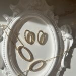 Ensemble tendance en acier inoxydable doré, composé d’un collier, d’une gourmette et d’une paire de boucles d’oreilles assorties. Chaque bijou est sublimé par un motif ovale ajouré, délicatement serti de pierres scintillantes pour un effet lumineux et moderne.