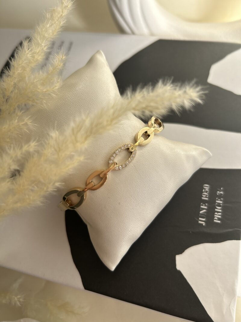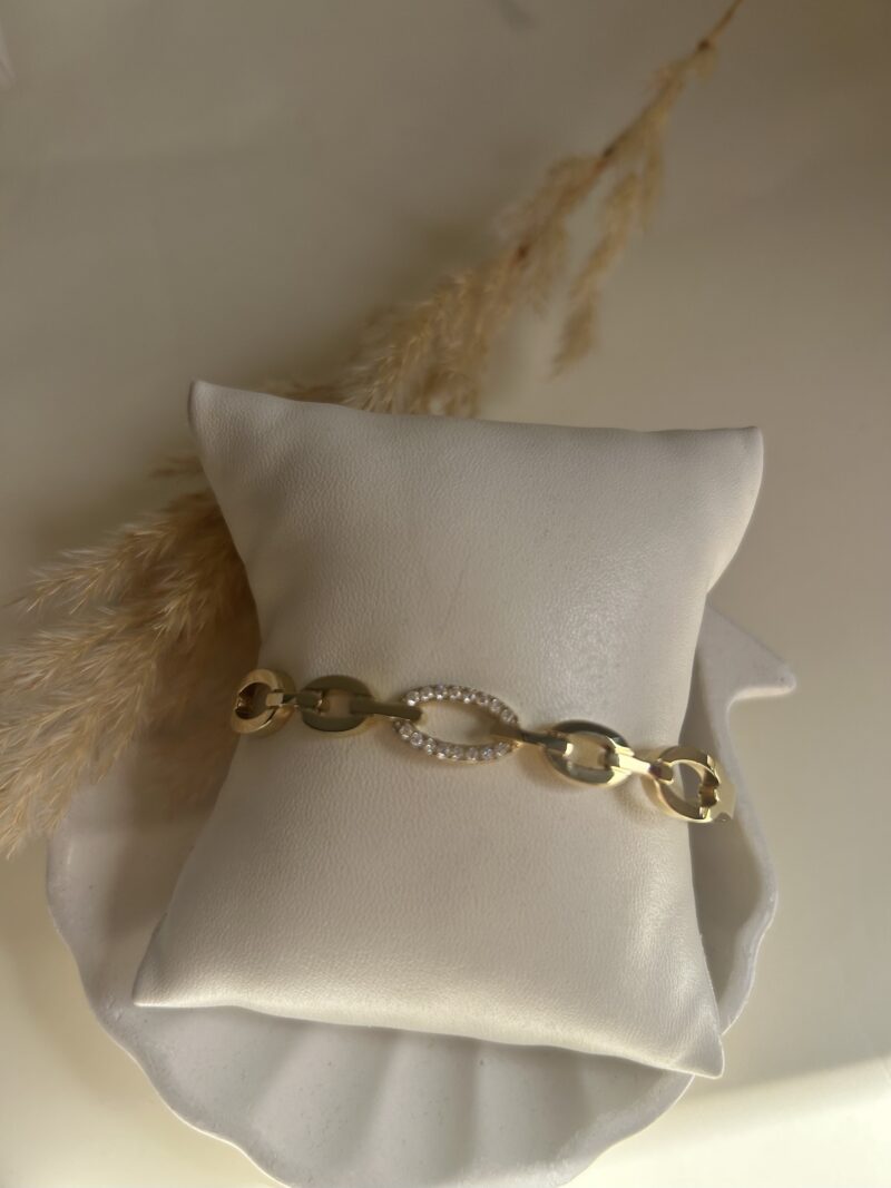Élégant et raffiné, ce bracelet à maillons dorés se distingue par un maillon central orné de strass étincelants. Subtile touche de brillance, il capte la lumière à chaque mouvement et apporte une note sophistiquée à votre poignet. Un bijou moderne et intemporel, parfait pour sublimer vos tenues de jour comme de soirée.