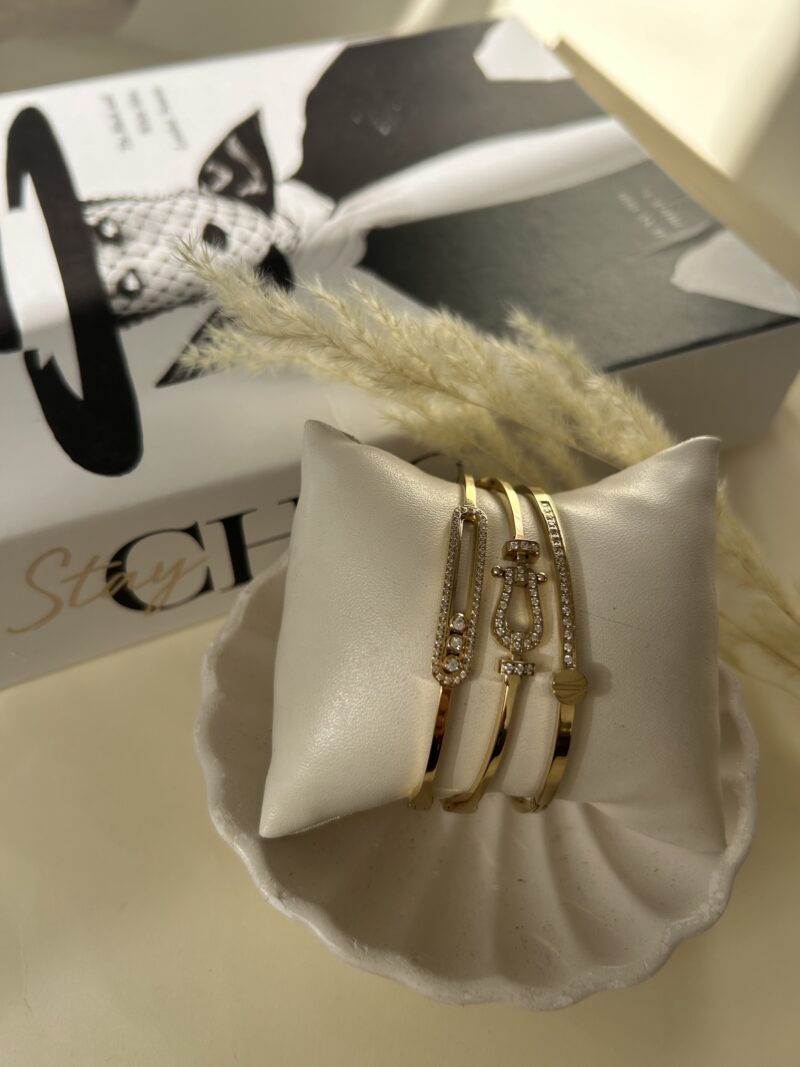 Ce coffret de trois bracelets en acier inoxydable doré illumine vos poignets avec élégance et raffinement :